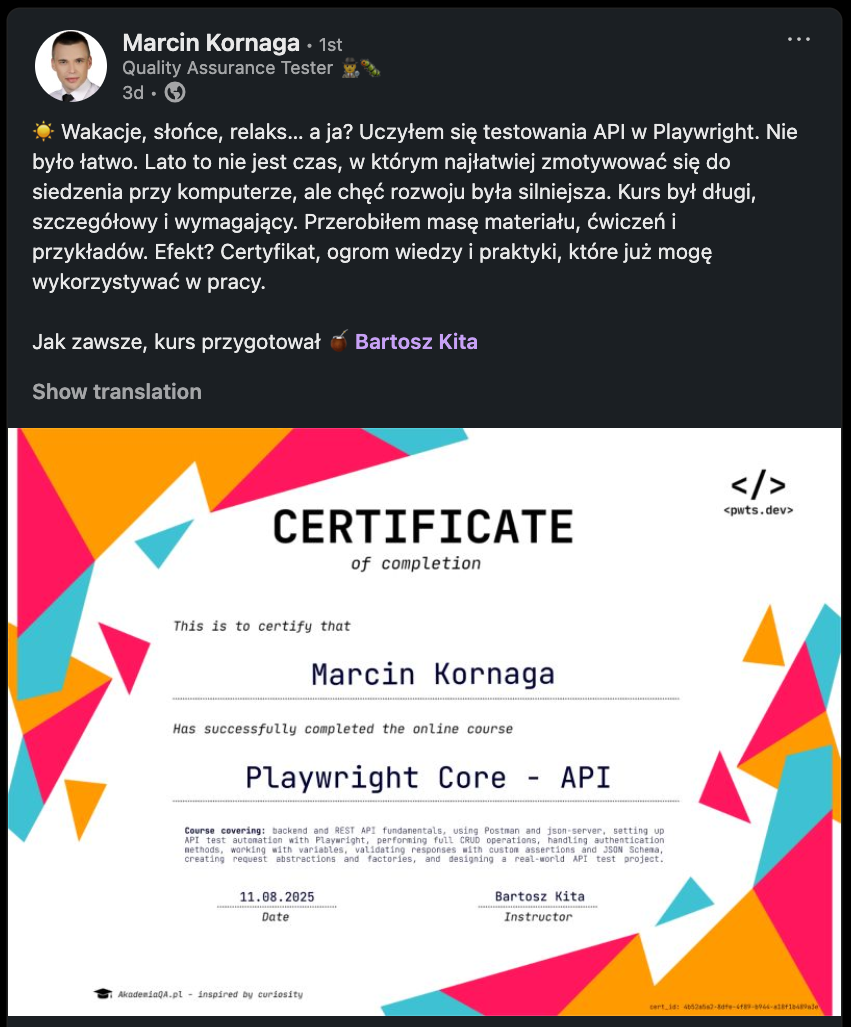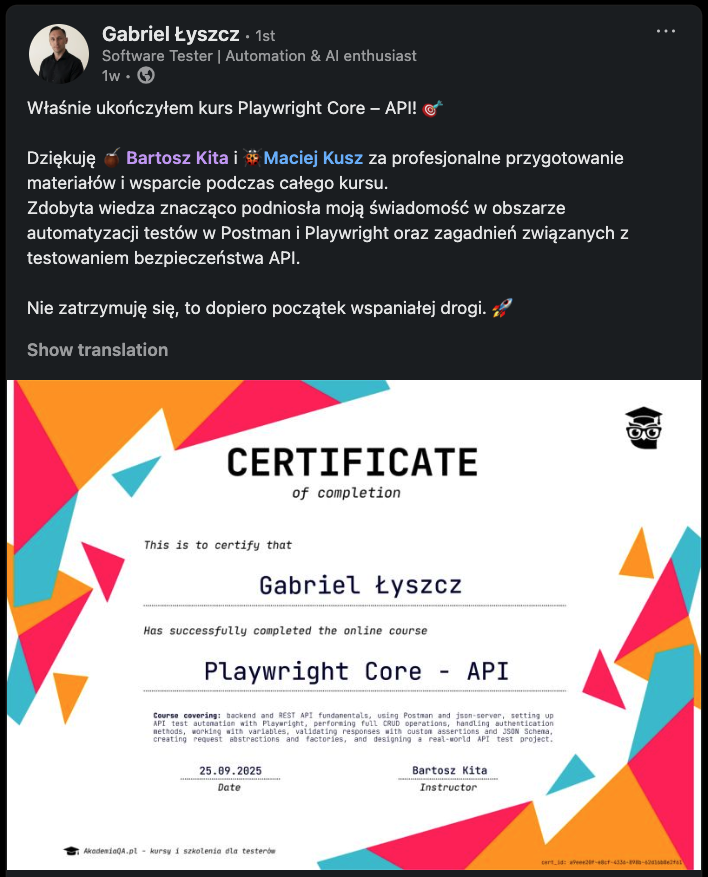 Playwright API to praktyczny program, który nauczy Cię automatyzować testy REST API w Playwright i TypeScript — od podstaw (Postman, json-server, request/response), przez budowę modularnego frameworka i realizację pełnego projektu BookstoreAPI (CRUD, JSON Schema, autoryzacja), dzięki czemu będziesz gotowy do pracy z testami API w realnych projektach.