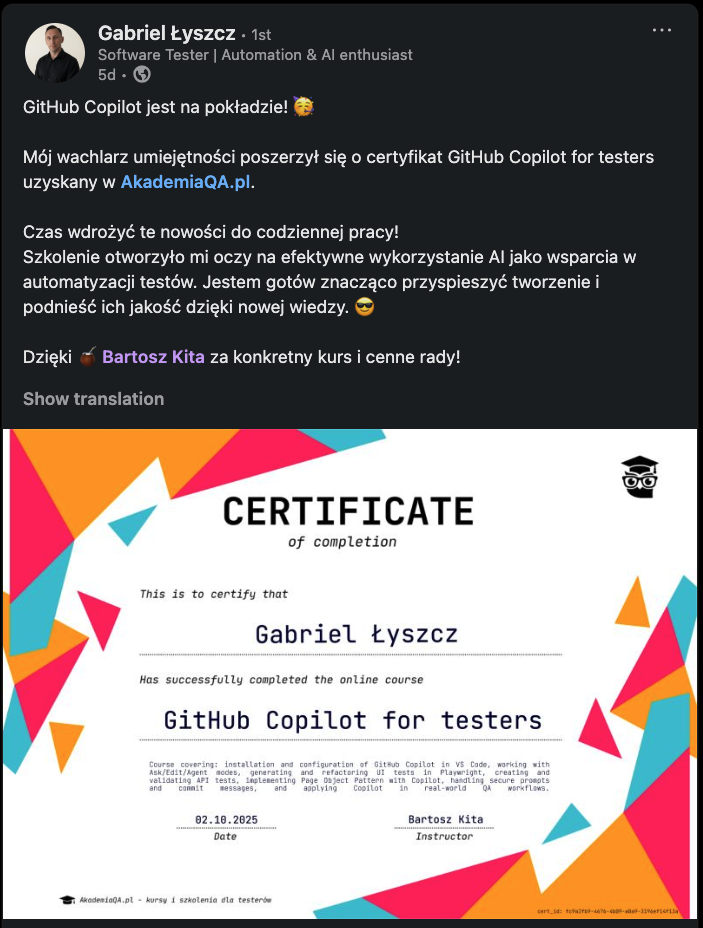 GitHub Copilot dla Testera to krótki, praktyczny kurs, który w godzinę pokaże Ci, jak wykorzystać AI do pisania testów UI i API, refaktoryzacji kodu oraz automatyzacji codziennych zadań testera – oszczędzając nawet 30 minut dziennie już od pierwszego dnia.